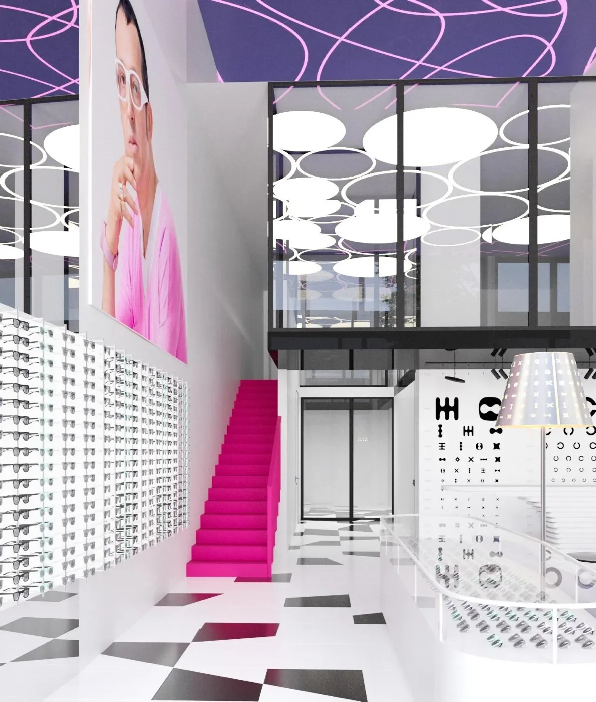 Современный магазин оптики с лаконичным дизайном и удобной планировкой. Продуманное освещение и минималистичный интерьер.